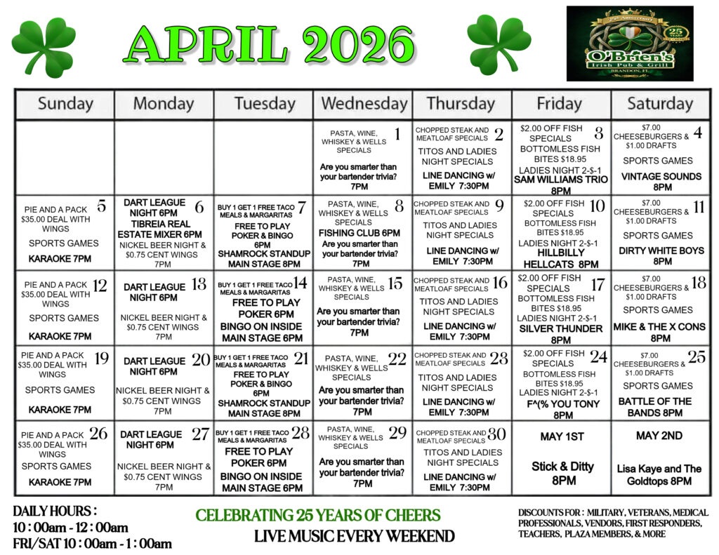 Check out our daily hours and what’s happening each night at O’Brien’s!